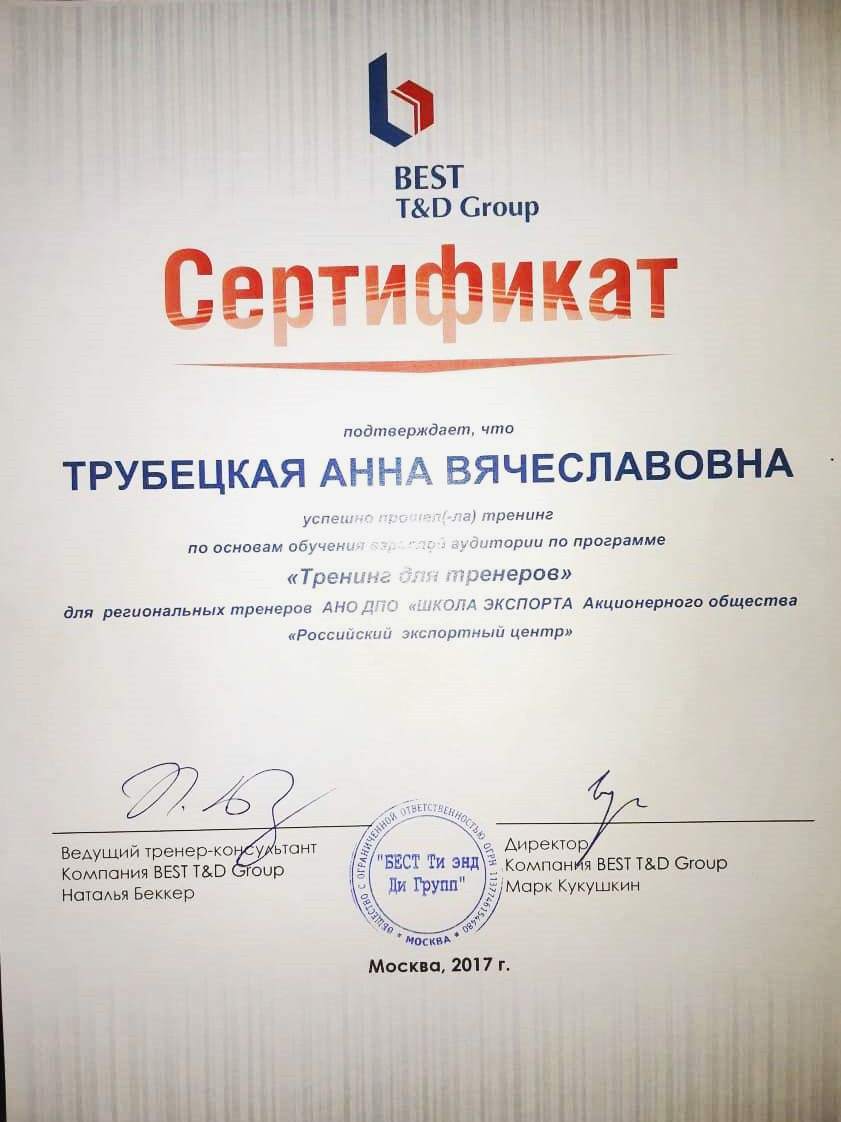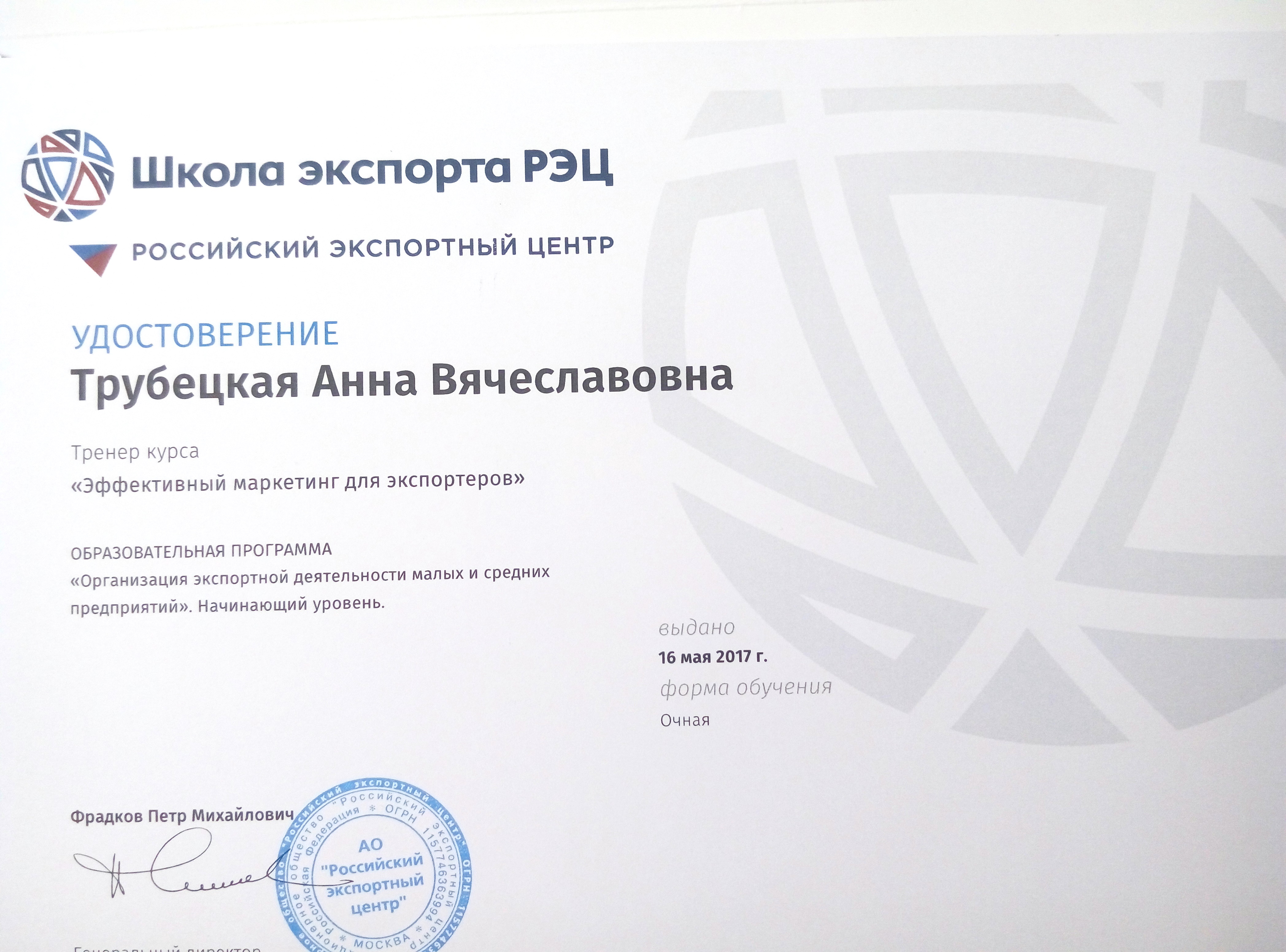 сертифицированный тренер по международному маркетингу Российского экспортного центра с 2017г.,