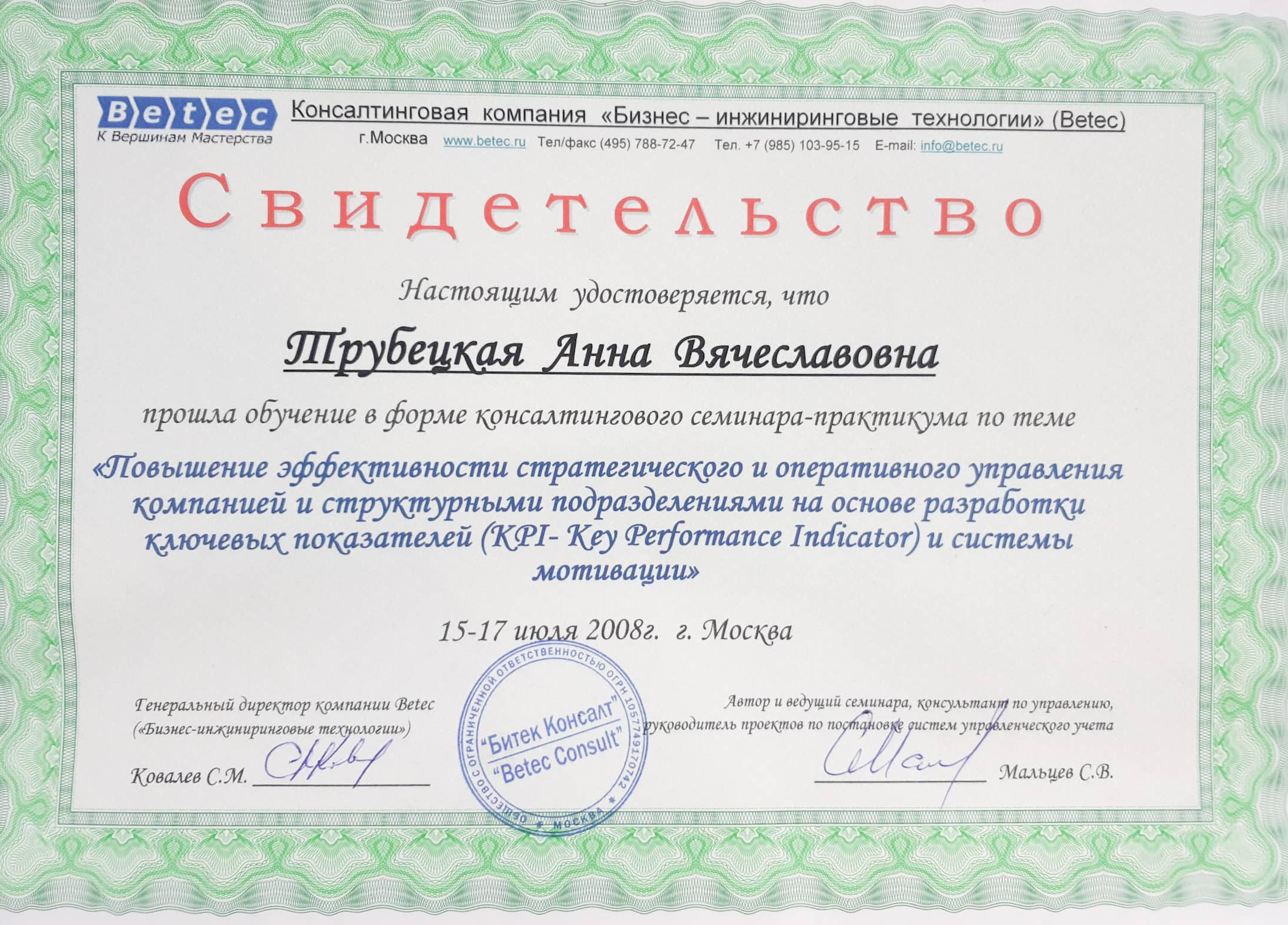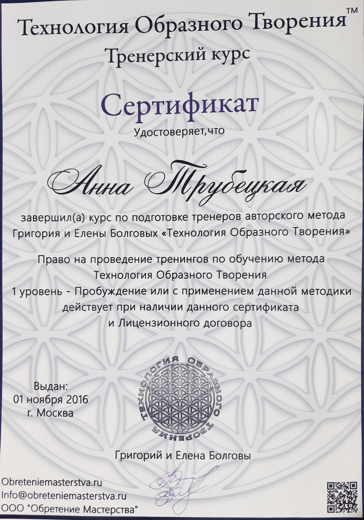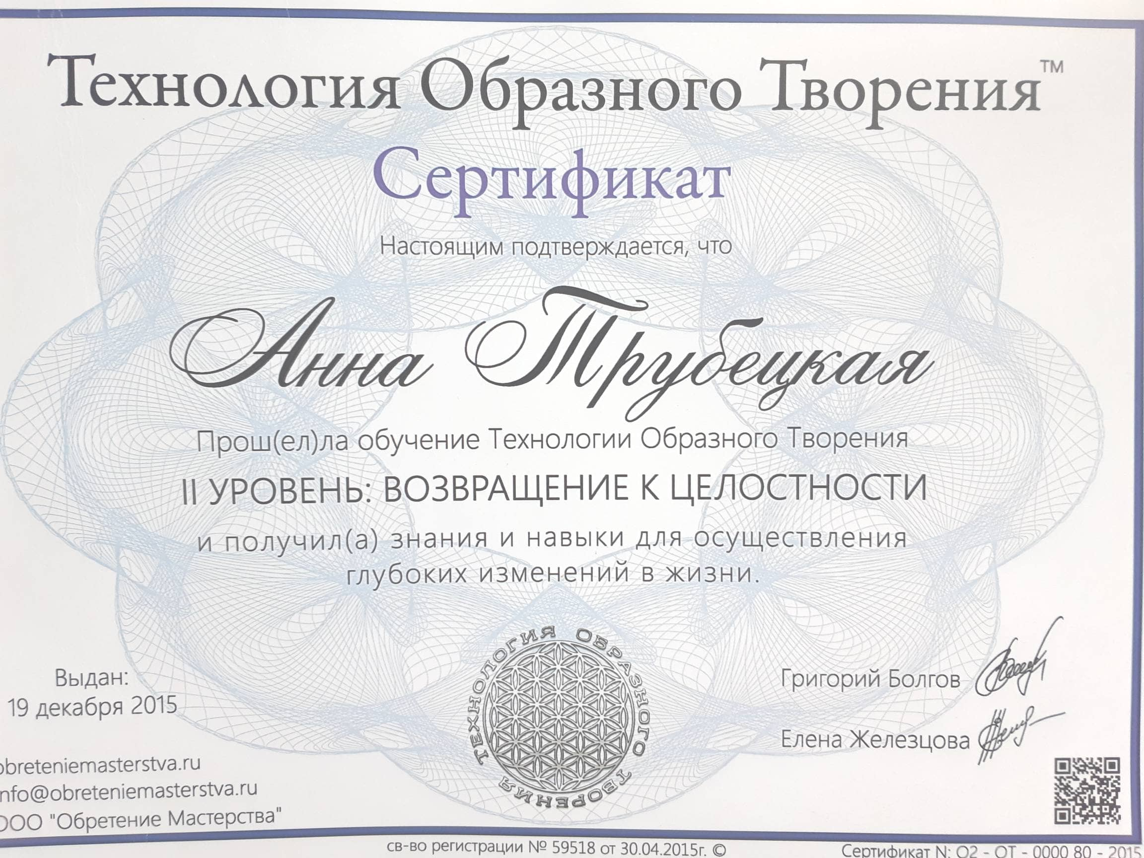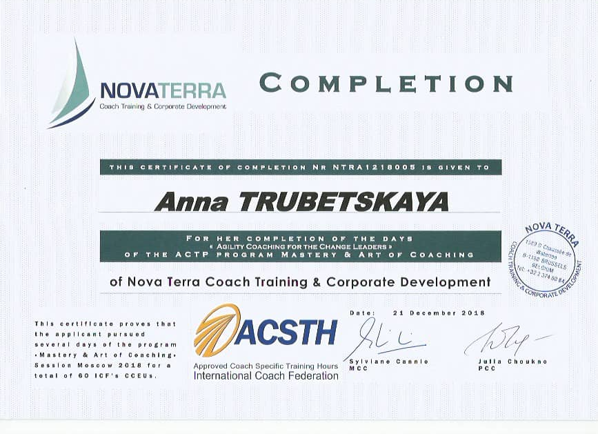 - сертифицированный тренер «Технологии Образного Творения» телесно-образной методики с 2014г, -сертифицированный коуч ACSTH International Coach Federation с 2018, Novoterra,