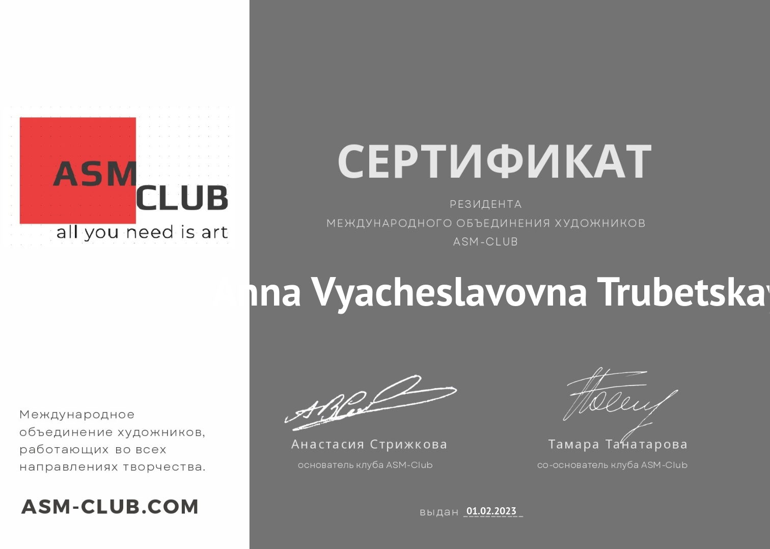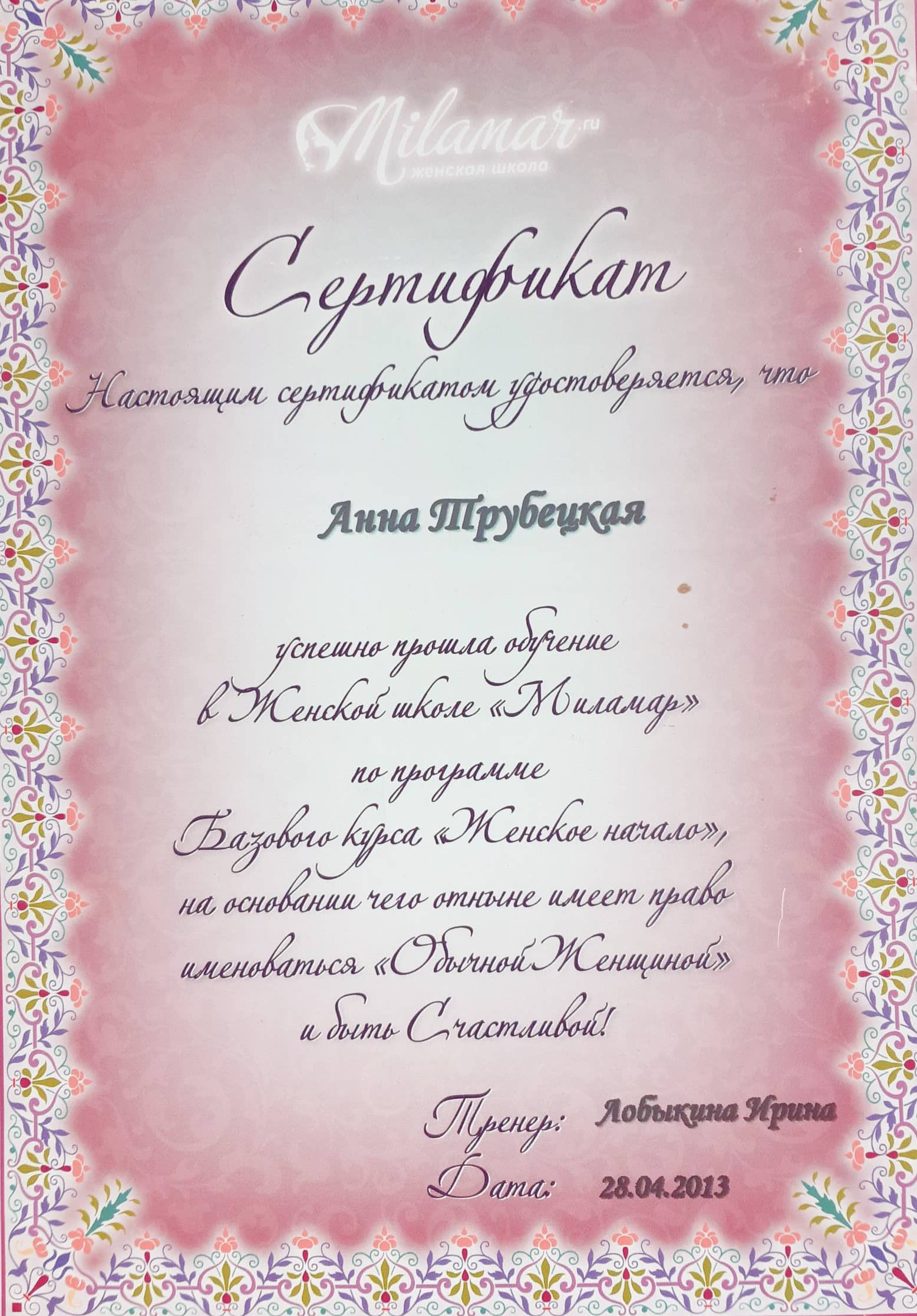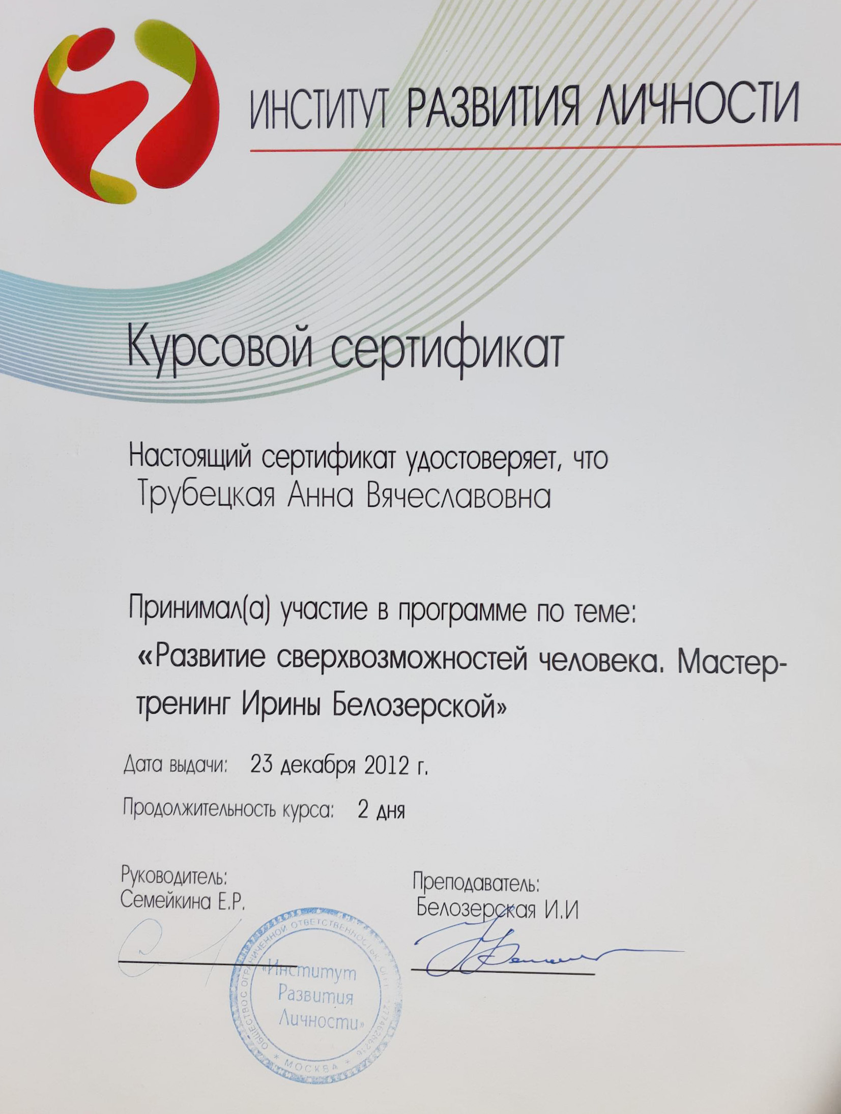 - сертифицированный тренер «Технологии Образного Творения» телесно-образной методики с 2014г, -сертифицированный коуч ACSTH International Coach Federation с 2018, Novoterra,